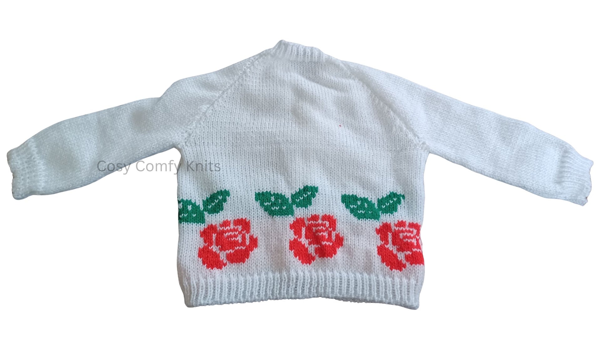 The front panels are adorned with vibrant red rose motifs and rich green leaves, inspired by timeless English garden designs. Matching red buttons run down the centre, adding a cheerful pop of colour and complementing the floral pattern perfectly. The cardigan is finished with neat ribbed cuffs and hem for a snug yet gentle fit.